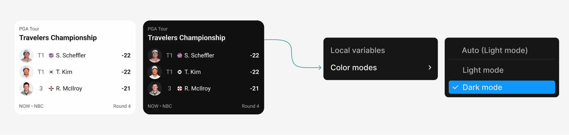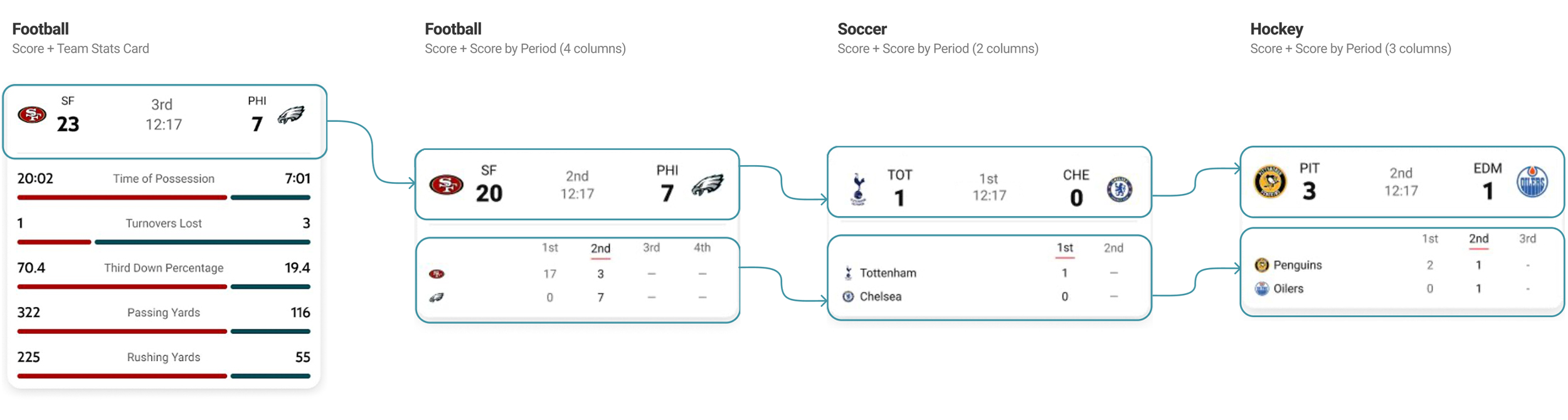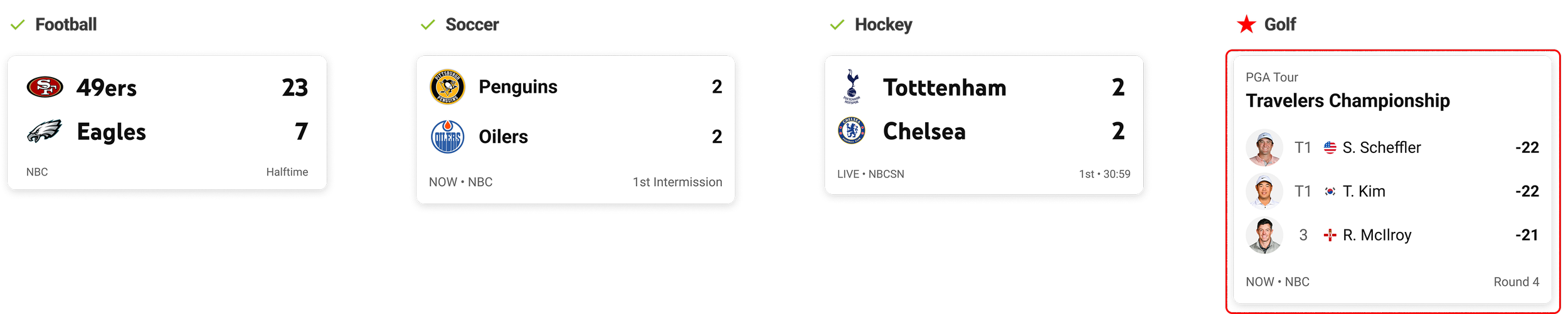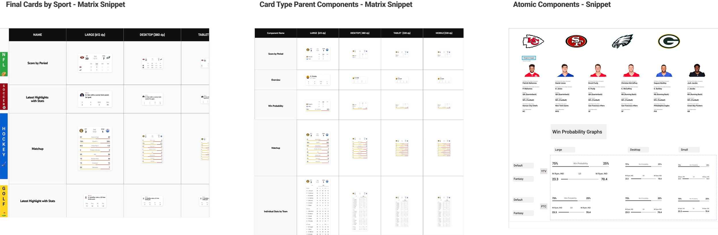 Layout scales across three sports except for golf. Golf being an individual player sport, research into golf stats, leaderboards, and ideation was required.