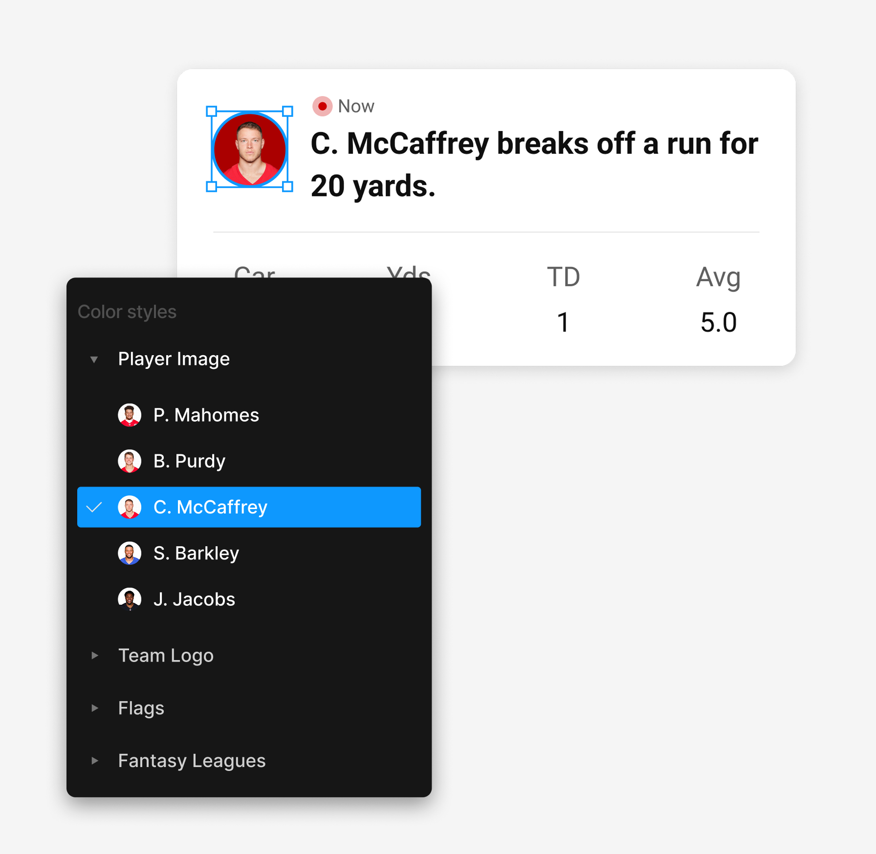 To change player images, team and league logos, we set PNG images as pre-set color styles for rapid mock-up capability. Additionally, using player images with transparent backgrounds allowed us to change the background team color behind the portraits conveniently. This not only helps the engineering team write great code but also makes the images future-proof in case the player changes teams, which they often do.