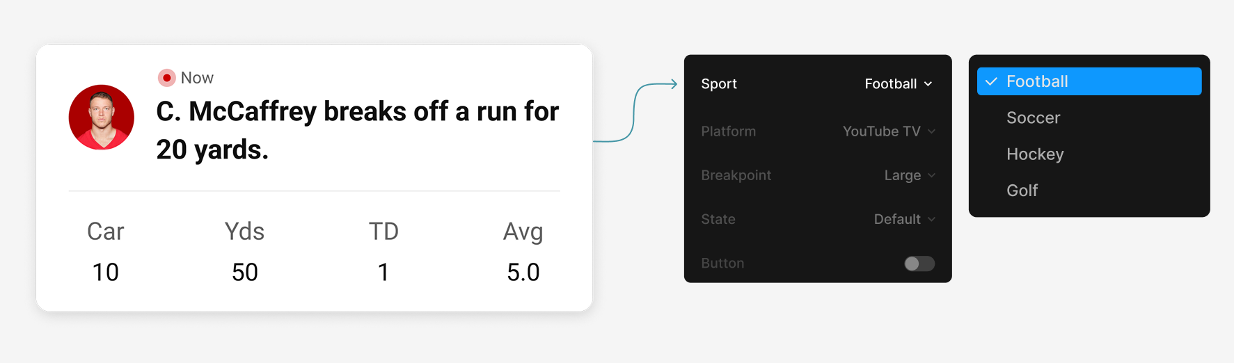 Figma options to flip through sports, platform, breakpoints, card states and other options